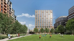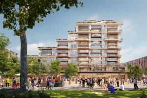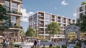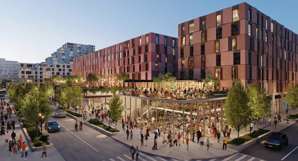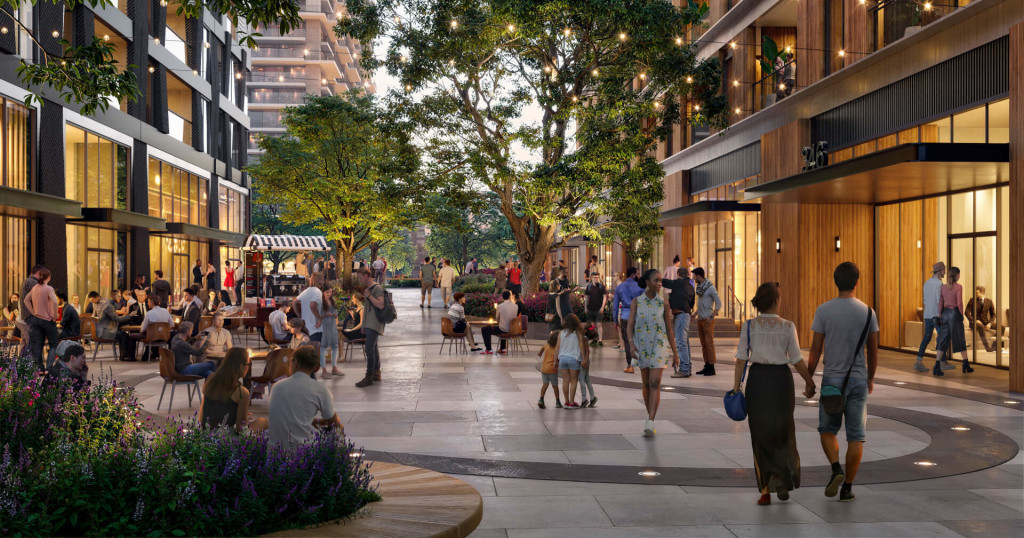 The buildings top out at 8 stories or less, apart from three high-rise office buildings, and employ a rich collection of architectural styles, enhancing the project’s sense of place and cultivating visual intrigue for residents and visitors. Stepped masses offer multi-level outdoor spaces and retreat from the street to increase daylight access at ground level. The buildings are stylistically tied together with a material palette of cement, metal, and wood paneling in natural colors native to the temperate environment. The architectural and programmatic diversity of the development, combined with the human scale of its structures, creates a dense, walkable village positioned nearby large employers and city attractions.